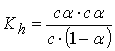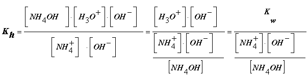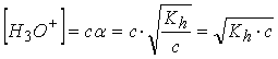 esta ecuación nos permite calcular la constante de hidrólisis conociendo Kw y la constante de disociación de la base débil (Kb). Es fácil calcular la concentración de protones si se conoce la concentración de la sal en disolución (c) y la fracción de dicha sal que se hidroliza (a). Vamos a verlo con un ejemplo:
