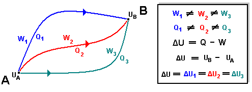 donde ∆U es la llamada variación de la energía interna, Q el calor y W el trabajo intercambiados por el sistema con el entorno. Observa que el signo negativo del trabajo proviene del criterio termodinámico de signos antes mencionado. La energía interna de un sistema es la suma de las energías que poseen las partículas microscópicas de las que está constituido, es decir, todas las energías cinéticas y potenciales, asociadas a sus partículas constituyentes. Por lo tanto, en la energía interna influyen energías tales como la energía térmica, la energía química, la energía de los electrones internos de cada uno de los átomos y la energía nuclear. En los procesos físicos y químicos más habituales, estas dos últimas no suelen intervenir, por lo que al no alterarse, la variación de la energía interna coincidirá con la variación conjunta de las energías térmica y química. No se puede conocer el valor absoluto de la energía interna de un sistema, sólo sus variaciones en un proceso determinado. La energía interna, U, es una función de estado, es decir, su valor sólo depende de los estados inicial y final del sistema y no del camino seguido para pasar de uno a otro. Por el contrario, el calor y el trabajo no son función de estado, su valor numérico depende tanto de las condiciones iniciales y finales como de los estados intermedios alcanzados para pasar de un estado a otro.